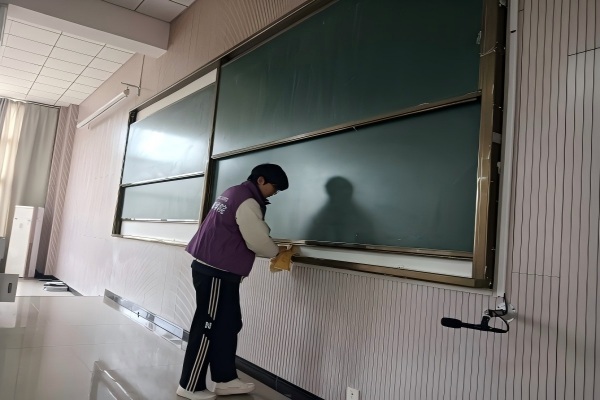 活动期间,后勤部工作人员率先垂范,主动带领志愿者投身清洁工作,以亲身实践传递劳动精神,引导志愿者理解后勤服务的价值与内涵。管理学院志愿者身着统一志愿服装,怀揣热情分工协作,有人俯身捡拾绿化带中的纸屑与杂物,有人仔细擦拭教学楼门窗、黑板、玻璃,有人合力清扫公共道路落叶。后勤工作人员结合岗位实际,向志愿者讲解校园环境维护的关键要点与日常保洁流程,让志愿者在劳动中深入了解后勤工作的艰辛与意义,实现了服务育人与劳动教育、志愿服务的有机统一。