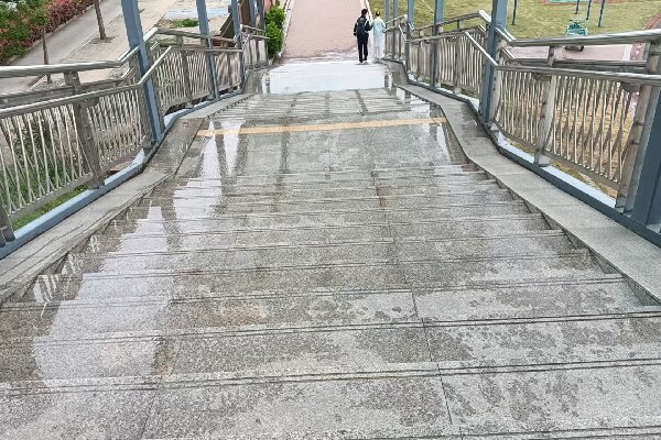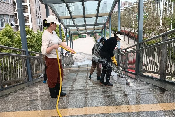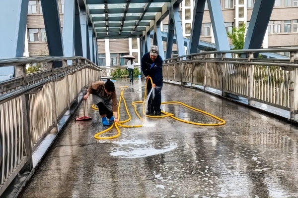 连接南北校区的过街天桥是师生日常通勤的必经之路,因人流量大、使用频率高,桥面、台阶边缘、立面和护栏容易积聚顽固油污,不仅影响校园整体美观,还增加了滑倒的安全隐患,针对这一问题,环境管理中心组织保洁人员对天桥开展清理整治,对桥面、台阶进行全面清扫冲洗,喷洒专用清洁剂去除积尘与顽固油污,保障桥面整洁防滑;对护栏扶手逐一擦拭消毒,全面提升天桥通行环境的整洁度、舒适度与安全性。
